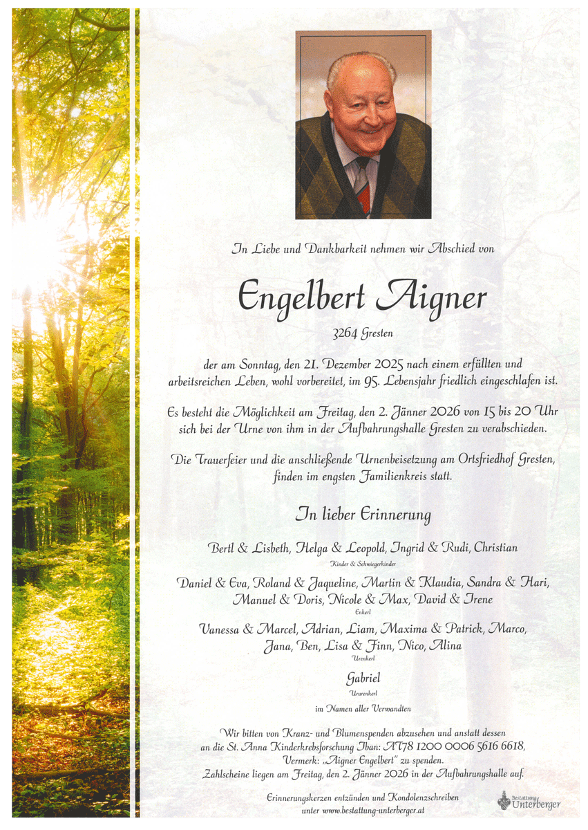 Lieber Herr Aigner mögen viele Engerl dich auf deiner letzten Reise begleiten! Erlöst von allen Schmerzen, frei von aller Last! Du bist heuer der 7. der über das Brückerl geht. Viel Trost allen die dieses Jahr einen Menschen verloren haben besonders deiner Familie die sich sehr um dich gekümmert haben als das Leben nicht mehr einfach für dich war. Sei du ihnen Allen ein Schutzengel.