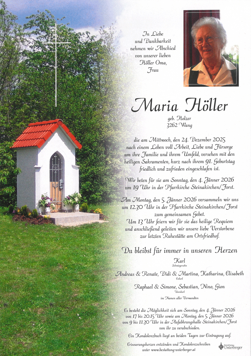 • Trauerfeier am 5. Jänner 2026 in Steinakirchen/Forst