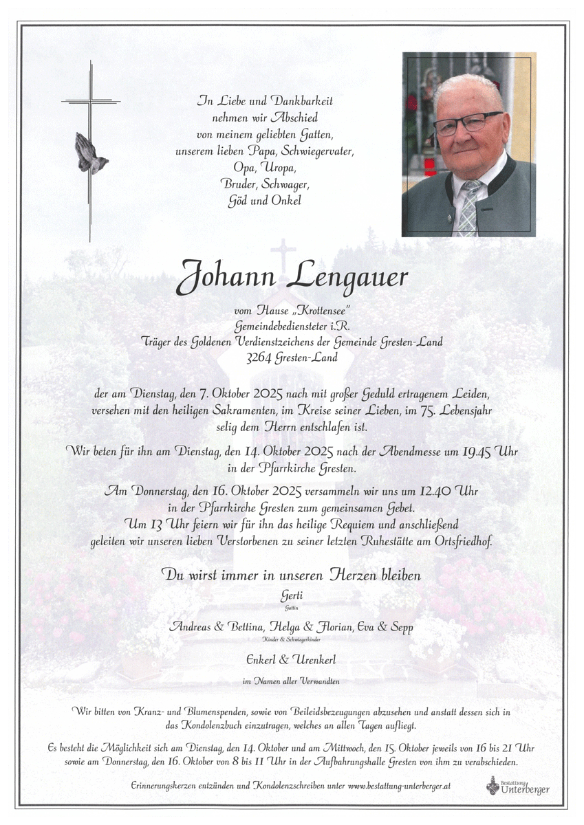 Liebe Familie Lengauer ! Herzliches Beileid aus Euratsfeld – Franz u Heidelinde Schneider mit Familie